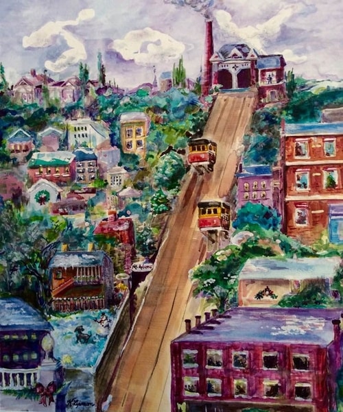 The Mt. Adams incline was more than a novelty, but helped scale the hills and gave folks an easier way to go to an fro from their stately homes on the top of the hill. (1876-1943) Fine Art Print 10 x 14 available for $30. Holiday Cards priced in various quantities.